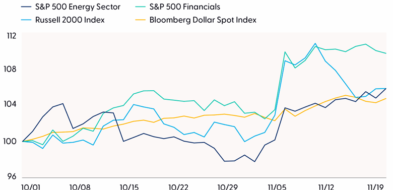 As the dollar began its upward path at a more strident rate in October, as nearly all areas of capital markets began assessing election outcomes, the dollar’s rise matched a similar move in equities as those sectors most closely aligned with a Trump victory began to outperform.
