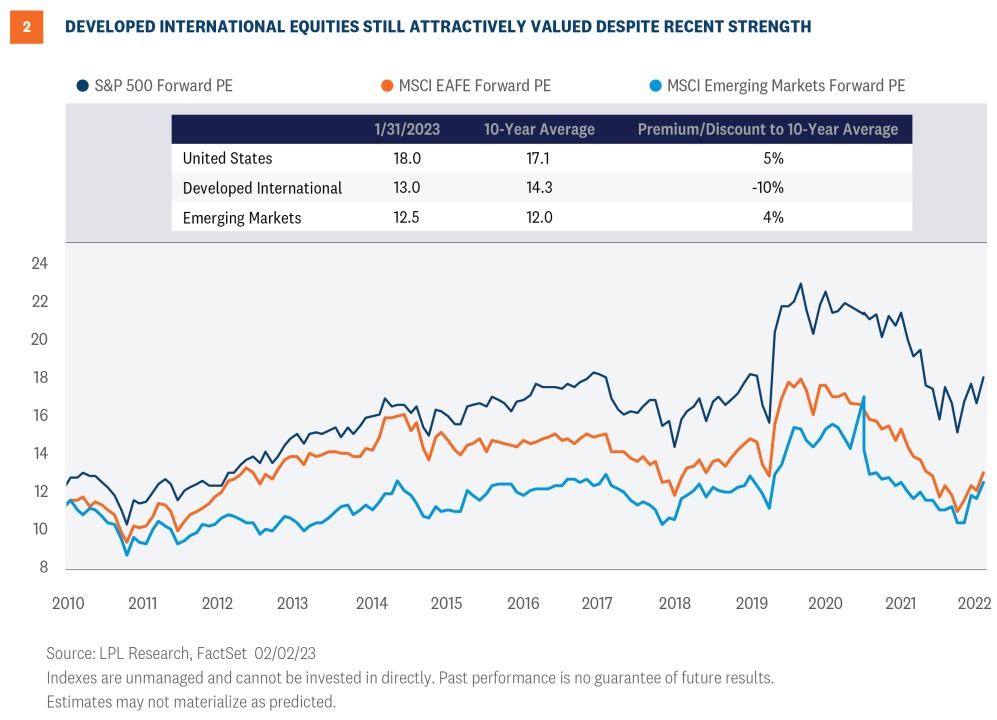 Absolute valuations relative to history also make international valuations look attractive. The current forward P/E of 13 for the MSCI EAFE is 10% below its 10-year average, while the U.S. and EM are 0.9 points and 0.5 points above average by the same measure.