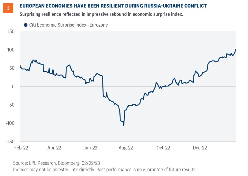Europe’s surprising resilience has undoubtedly been part of the improving international story. European markets have demonstrated solid resilience despite mounting concerns over the ongoing Russia/Ukraine conflict, natural gas supplies, interest rates climbing higher as the European Central Bank (ECB) continues to raise rates, and a slow start to China’s reopening.