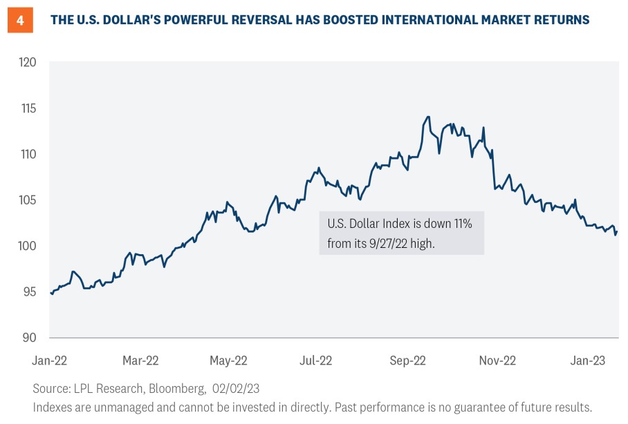 In early 2023, the dollar transitioned from being a headwind to a tailwind that could help underpin multinational earnings and U.S. investor returns in non-U.S. investments. Companies with a strong input from foreign earnings are seeing more interest from investors than companies that are more domestically focused. The currency translation to dollars is now helping earnings rather than hurting them.