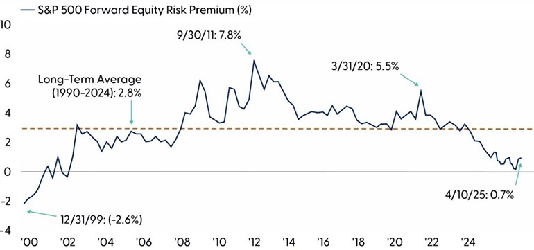 Higher yields reduce the equity risk premium for stocks, offering little compensation for the risk