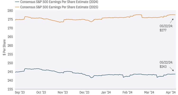 Looking out to 2025, slower economic growth may present a headwind. But if the AI capital investment cycle remains strong, then another year of high-single-digit earnings growth next year is quite possible. Our $250 estimate for S&P 500 EPS in 2025, much like our estimate for 2024, is probably too low, so expect that number to also be revised in Midyear Outlook 2024, due out in early July.
