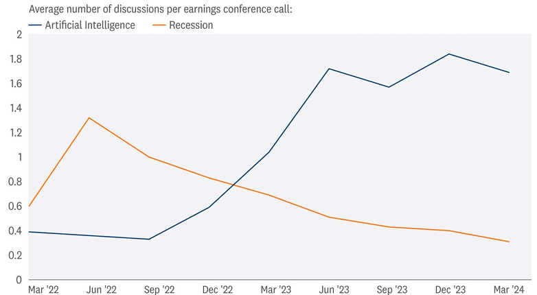 This concentration of earnings power has some investors worried. But more balanced earnings growth will likely come by the end of the year as earnings growth outside of mega cap technology accelerates, and the law of large numbers contributes to slower growth for the space. This may contribute to better performance for value stocks, but we think it’s still a bit too early to make that shift given the strength in artificial intelligence (AI). As the chart below illustrates, AI has been a hot topic on company earnings calls this quarter, and it’s not just the AI companies talking. That means more productivity is likely coming, and with it comes greater profitability for corporate America.