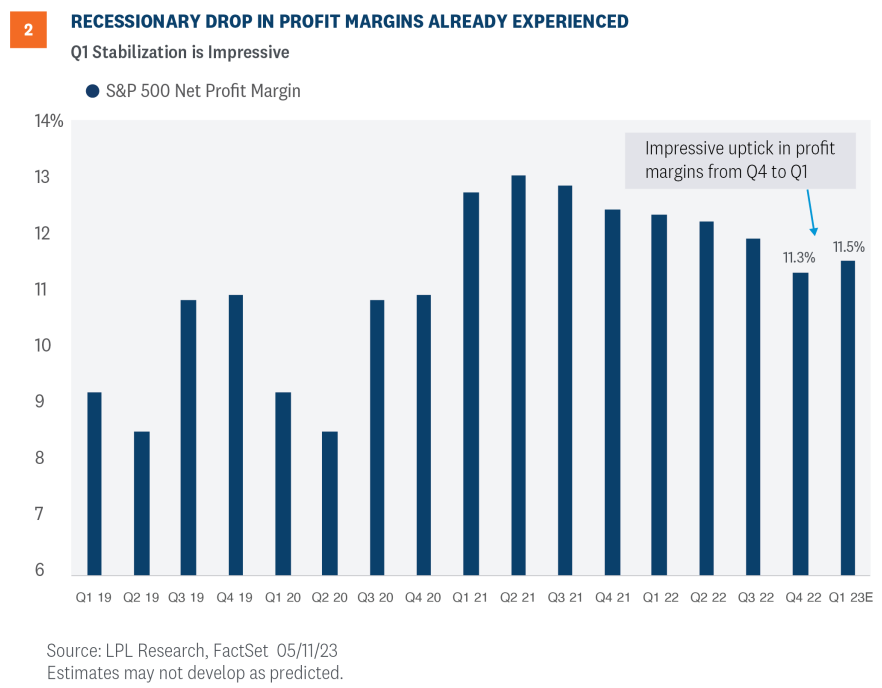 First quarter earnings season is nearly complete, and it has caused us to regret titling our earnings preview commentary on April 10, “Malaise Continues.” While the “better than feared” label fit the past couple of earnings seasons quite well, based on the magnitude of upside surprises in the first quarter, and encouraging guidance from corporate America, that’s probably underselling it. There’s plenty to worry about the rest of the year (debt limit, recession, tightening financial conditions, a Federal Reserve (Fed) policy mistake, among them), but the risk of an additional sharp contraction in profit margins has come way down.