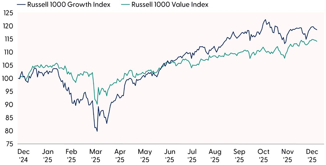 Large Growth Over Small and Mid Value — Hit. Continuing with the mega cap theme, our Strategic and Tactical Asset Allocation Committee (STAAC) maintained its preference for growth over value throughout all of 2025, with a large cap growth overweight and small and mid cap value underweight. The growth style paced large caps, with the Russell 1000 Growth Index outperforming its Value counterpart by 2.7% (18.6% to 15.9%) for the year. Meanwhile, small and mid cap value, measured by the Russell 2500 Value Index, underperformed large value and large growth with just a 12.7% return.
