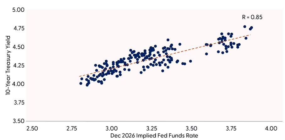 If the Fed maintains a “slightly restrictive” stance, as it has suggested, the 10-year yield may remain elevated relative to historical neutral levels. However, any shift in the Fed’s tone — whether toward easing or a more neutral posture — could prompt a recalibration in market pricing, particularly if inflation continues to moderate and growth slows. Ultimately, our rate outlook reflects a balance between what the Fed is likely to do and what markets have already priced in, with the neutral rate serving as a key reference point in that assessment.