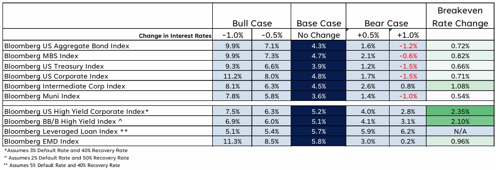 While riskier segments within the fixed income market have higher starting yields, the potential for spread widening and increased default activity leaves hypothetical returns below core bond sectors in most expected environments. A stable or slightly higher interest rate environment and even tighter spreads are needed for high yield and leveraged loan sectors to outperform core sectors. We remain neutral (although biased negative for tactical models) on both asset classes but would lean towards high yield over leveraged loans, if pressed, given the potential for price appreciation if interest rates fall.