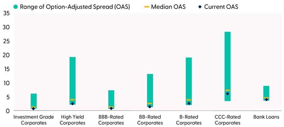 Despite these challenges, the broader credit market is not in crisis, nor do we think we are on the cusp of systemic credit issues. Our issue is with market valuations. Credit spreads, or the additional compensation for owning risky debt, remain historically tight given these rising idiosyncratic risks. Both high-grade and high-yield companies currently enjoy spreads at or near the lowest levels over the past 20 years. Only CCC-rated companies, which are the ones most prone to default, have spreads above recent secular tights. But even these spreads are only in the 29th percentile versus history, meaning spreads for these companies have been higher 71% of the time over the past 20 years. Given the increased risks but still solid economic growth, though, we expect spreads to widen somewhat from current levels but to remain below long-term averages.