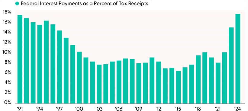 While the on-again/off-again tariff bruhaha introduces potential market volatility to the Treasury market, the actual impact of tariffs is mixed. Tariffs, as a trade policy lever, introduce a tug-of-war interaction between inflationary pressures (higher yields), slowing growth expectations (lower yields), and the potential to increase federal revenue (lower yields). The initial reaction from Trump’s sweeping tariffs on April 2 has pushed the 10-year Treasury yield some 50 basis points higher as markets have priced in a more hawkish Federal Reserve (Fed) response to rising price pressures. Further increasing yields, however, are growing concerns about debt and deficit spending as the Republican’s tax bill gets legislated through Congress.