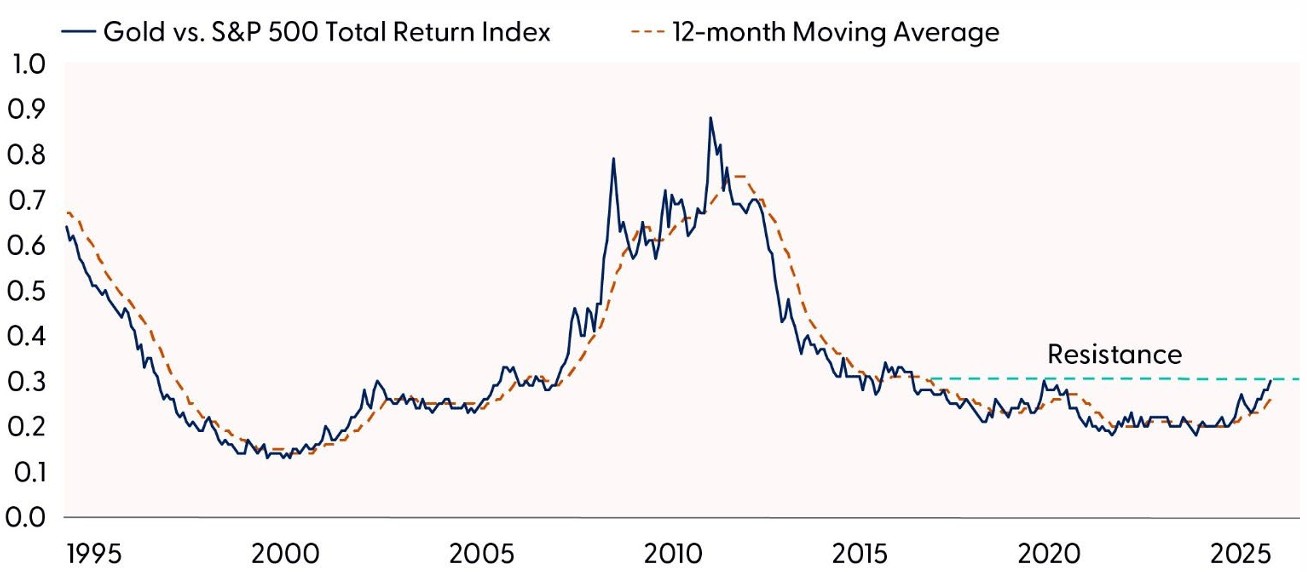 The “Relative Strength in Gold Reaches an Inflection Point” chart illustrates the long‑term relationship between gold and the S&P 500 Total Return Index over the past 30 years. A rising ratio signifies periods when gold is outperforming the broader market, while a declining ratio reflects equity leadership. The pair now sits at a critical inflection point connected by the peaks from 2015 and 2020. A breakout above this key resistance area could signal the start of a more secular phase of gold outperformance, whereas a failure to break through would suggest a renewed shift back toward equity market leadership.