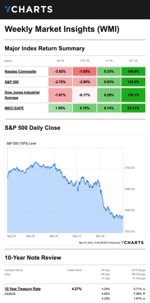 Source: YCharts.com, March 29, 2025. Weekly performance is measured from Monday, March 24, to Friday, March 28. TR = total return for the index, which includes any dividends as well as any other cash distributions during the period. Treasury note yield is expressed in basis points.