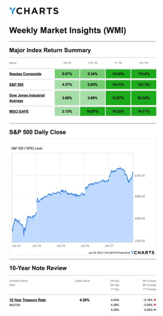 Source: YCharts.com, June 28, 2025. Weekly performance is measured from Monday, June 23, to Friday, June 27. TR = total return for the index, which includes any dividends as well as any other cash distributions during the period. Treasury note yield is expressed in basis points.