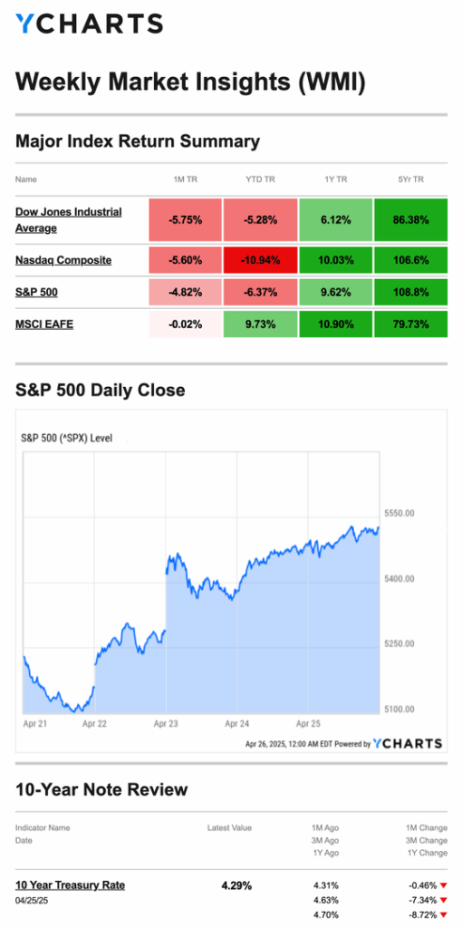 Source: YCharts.com, April 26, 2025. Weekly performance is measured from Monday, April 21, to Friday, April 25. TR = total return for the index, which includes any dividends as well as any other cash distributions during the period. Treasury note yield is expressed in basis points.