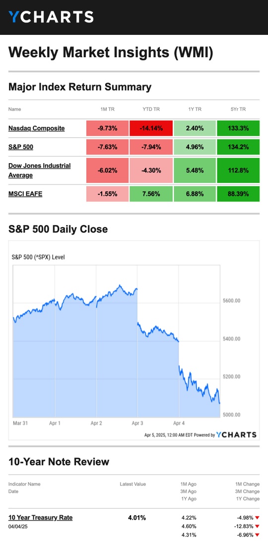 Source: YCharts.com, April 5, 2025. Weekly performance is measured from Monday, March 31, to Friday, April 4. TR = total return for the index, which includes any dividends as well as any other cash distributions during the period. Treasury note yield is expressed in basis points.