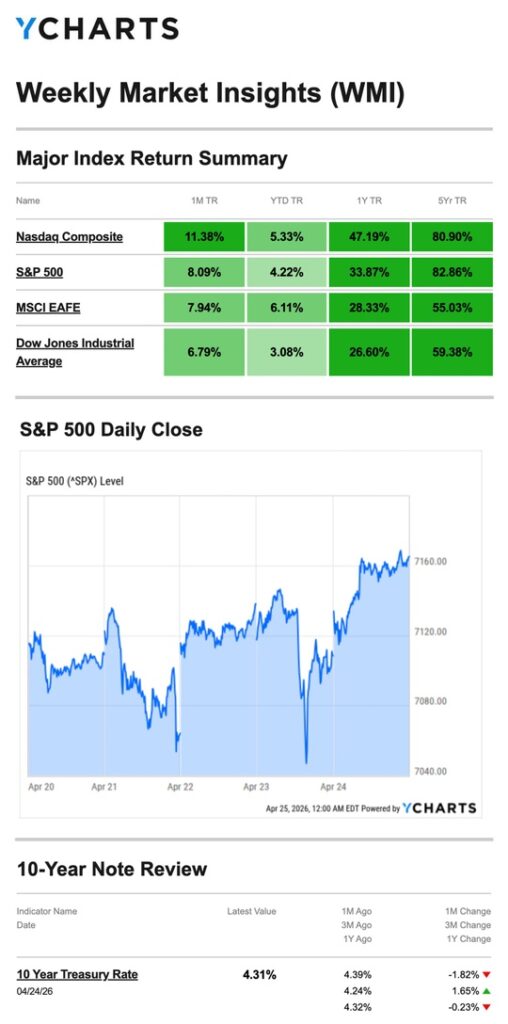 Source: YCharts.com, April 25, 2026. Weekly performance is measured from Monday, April 20 to Friday, April 24. TR = total return for the index, which includes any dividends as well as any other cash distributions during the period. Treasury note yield is expressed in basis points.