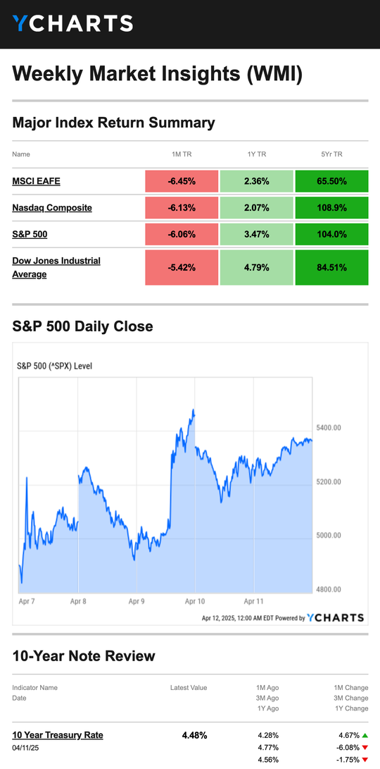 Source: YCharts.com, April 12, 2025. Weekly performance is measured from Monday, April 7, to Friday, April 11. TR = total return for the index, which includes any dividends as well as any other cash distributions during the period. Treasury note yield is expressed in basis points.
