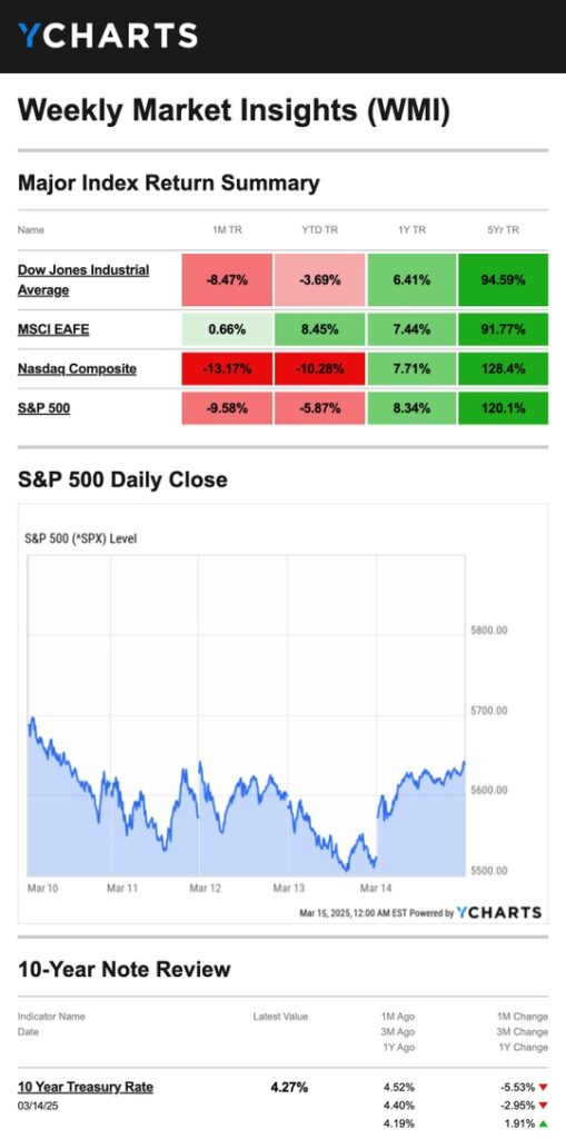 Source: YCharts.com, March 15, 2025. Weekly performance is measured from Monday, March 10, to Friday, March 14. TR = total return for the index, which includes any dividends as well as any other cash distributions during the period. Treasury note yield is expressed in basis points.