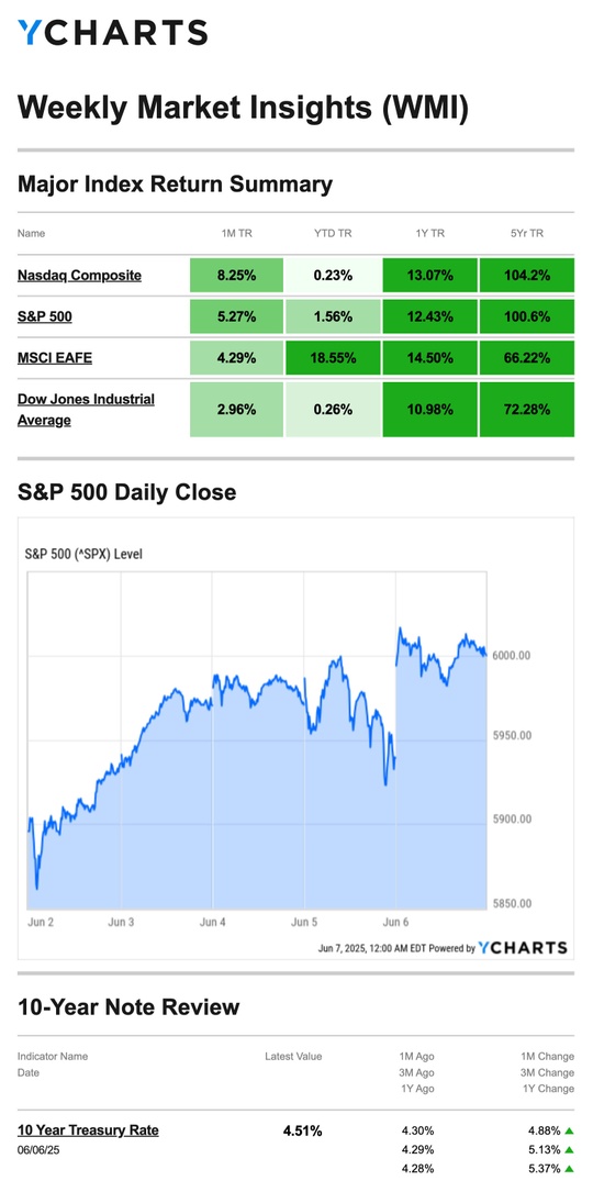 Source: YCharts.com, June 7, 2025. Weekly performance is measured from Monday, June 2, to Friday, June 6. TR = total return for the index, which includes any dividends as well as any other cash distributions during the period. Treasury note yield is expressed in basis points.
