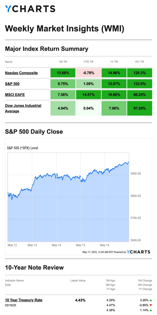 Source: YCharts.com, May 17, 2025. Weekly performance is measured from Monday, May 12, to Friday, May 16. TR = total return for the index, which includes any dividends as well as any other cash distributions during the period. Treasury note yield is expressed in basis points.