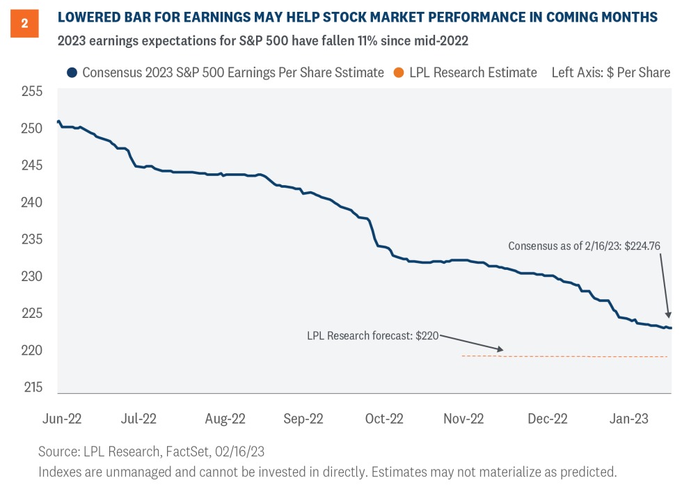 Despite lackluster overall results, we see a silver lining amid the sea of red numbers. Earnings estimates for 2023 have been widely considered to be too high based on historical earnings declines in recessions. The consensus estimate for S&P 500 earnings this year has come down 3% since the year began, lowering the bar. Earnings estimates have not collapsed, but corporate America has sure brought expectations down (Figure 2). Cautious guidance has made estimates more realistic.