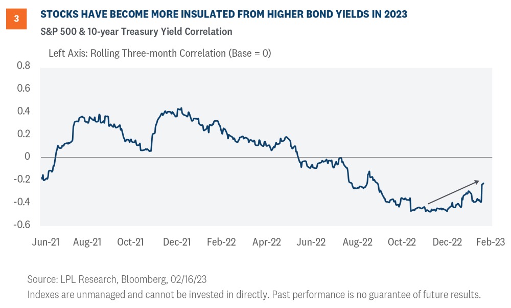Here we focus on the interest rate relationship. Last year, stocks and yields moved mostly in opposite directions. When inflation expectations and interest rates moved higher, stocks tended to sell off and vice versa. But we have seen this relationship change recently, as stocks and yields have risen together. Specifically, since January 25, the 10-year Treasury yield has risen roughly 50 basis points while the S&P 500 has gained 2%. That’s not much, but as Figure 3 shows, it suggests a more resilient equity market in the face of higher-than-expected inflation data. Last year, the market response to pricing in more Fed rate hikes would have been much more negative.